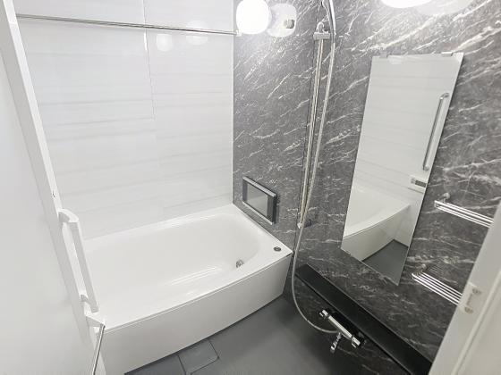 高級感あふれる石目調のパネルが印象的なバスルーム。
