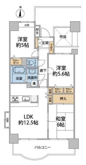 ✅ 間取り: 3LDK(LDK約12.5帖、洋室約5帖、洋室約5.6帖、和室6帖)です 。